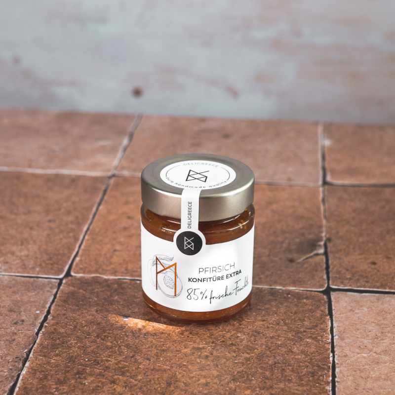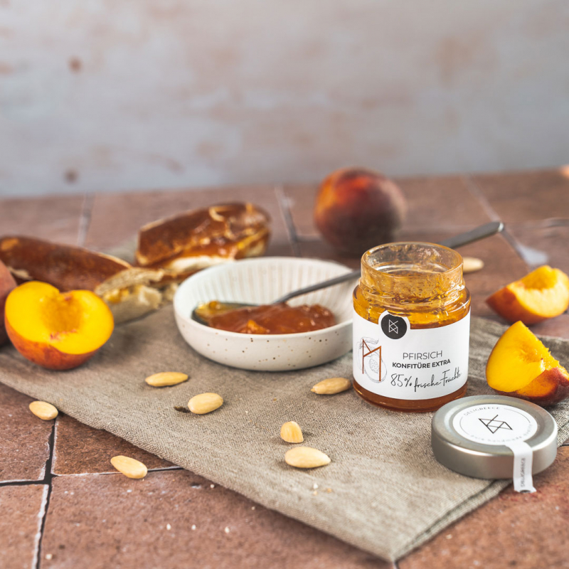 Unsere Pfirsich Konfitüre Extra wird aus saftreifen und aromatischen Pfirsichen hergestellt und bietet einen herrlich erfrischenden Geschmack. Mit 85% frischen Pfirsichen ist sie unglaublich intensiv und einzigartig auf dem Markt. Wir verzichten komplett auf Zusatzstoffe, Geliermittel und künstliche Stoffe, um den reinen Genuss der Früchte zu bewahren. Die sinnenbetörenden Farben und Aromen unserer Konfitüre bringen den Sommer näher, selbst wenn die Seele im tiefsten Winter steckt.