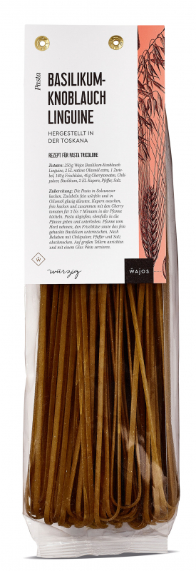 Unsere Basilikum-Knoblauch Linguine werden nach traditioneller italienischer Art hergestellt und sind ein wahrer Hochgenuss. Sie sind der Garant für ein perfekt mediterranes Menü in den eigenen vier Wänden. Diese würzige Pasta-Variation zeichnet sich durch ihre flache und etwas breitere Form aus, die zwischen Spaghetti und Bandnudeln liegt. Der frische Geschmack von Basilikum und Knoblauch verleiht den Linguine eine besondere Note.