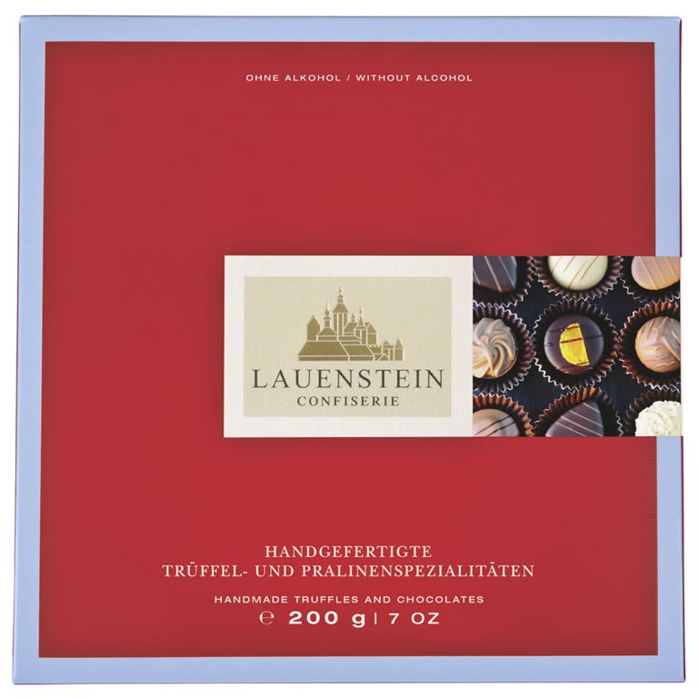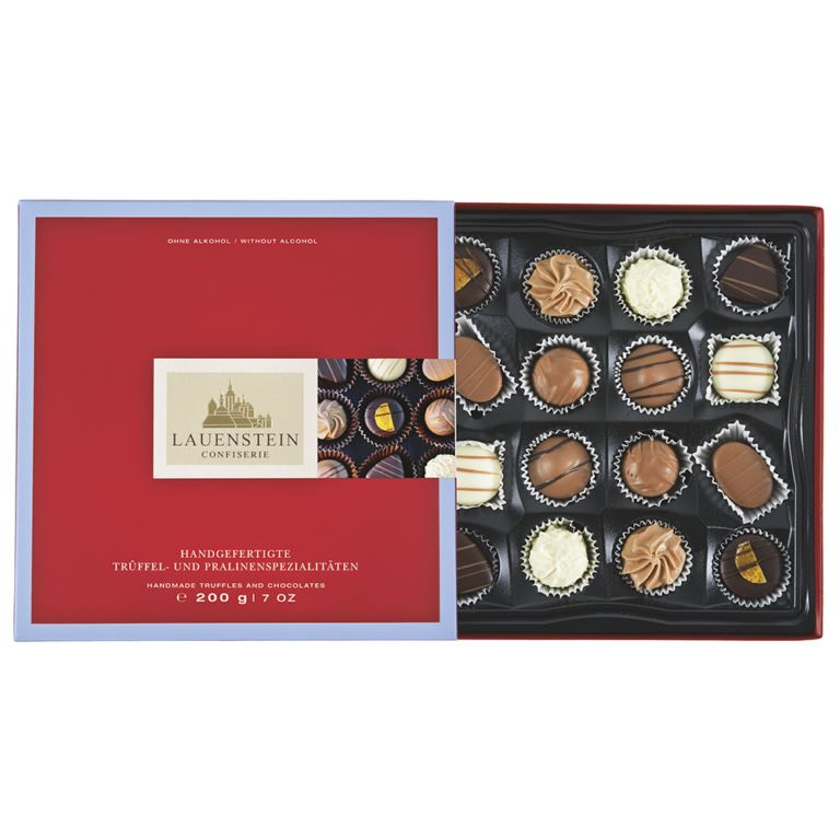 Die alkoholfreie Trüffel- und Pralinen-Auslese bietet eine exquisite Auswahl feinster handgefertigter Pralinen und Trüffel, die in acht Sorten begeistert. Darunter köstliche Kreationen wie Nougat-Törtchen, Waffel-Nougat, Amarena-Nougat, Karamell-Sahne-Trüffel, Orangen-Karamell-Sahne-Trüffel, Mokka-Praline, Waldfrucht-Trüffel und Gianduja-Nougat. Diese edlen Pralinen eignen sich hervorragend als Begleitung zum Kaffee oder Tee und sind ein feiner Gaumenschmaus für besondere Momente. Ohne Alkohol und aus reinsten, erlesenen Rohstoffen gefertigt, bietet die Confiserie Lauenstein höchste Qualität und Genuss.Inhalt: Nougat-Törtchen, Wafel-Nougat, Amarena-Nougat, Karamell-Sahne-Trüffel, Orangen-Karamell-Sahne-Trüffel, Mokka-Praline, Waldfrucht-Trüffel, Gianduja-Nougat.